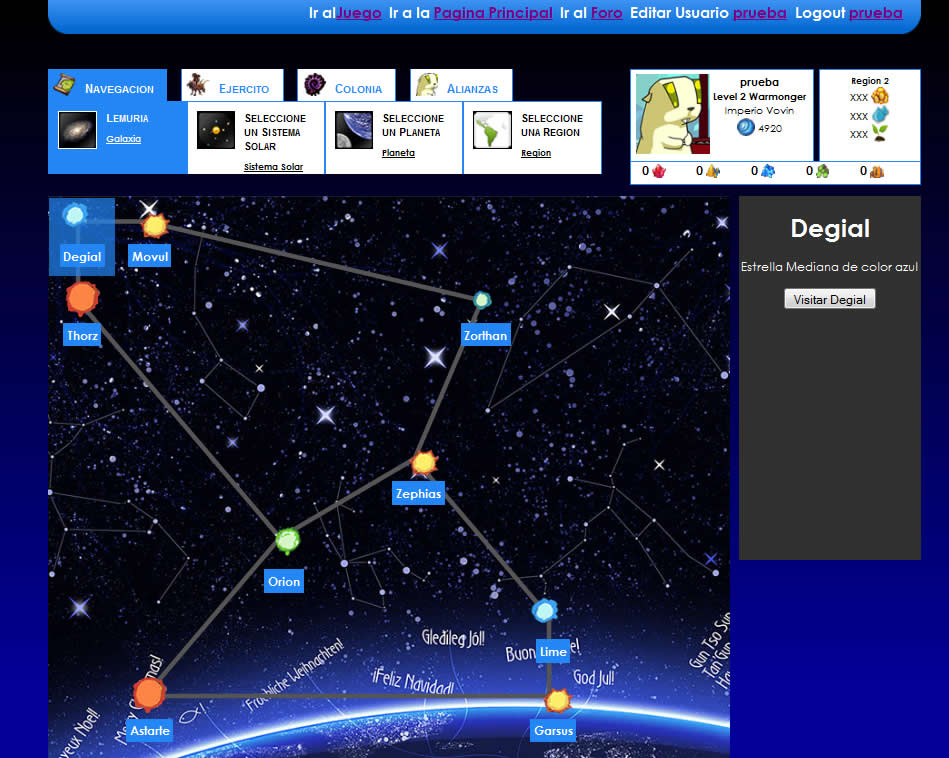 La Vista galaxia es todo un reto. Debido a que tengo que mostrar las vias estelares entre cada estrella, tengo qeu hacer uso ya sea de SVG o de Canvas. Debido a mi anterior experiencia con SVG me propuse a usar Raphael para dicho proposito. No fue facil y definitivamente hay muchos problemas entre Jquery Y Raphael, no malentiendan, los dos pueden funcionar en la misma pagina pero usarlos juntos es todo un problema. Pero gracias a la propiedad position:relative de CSS, puse el SVG como fondo de mi mapa principal. Asunto arreglado =). Por el momento esta actualizacion estara en mi servidor local hasta que arregle un par de errores que encontre, pero les dejo la imagen para que vean de que trata!.